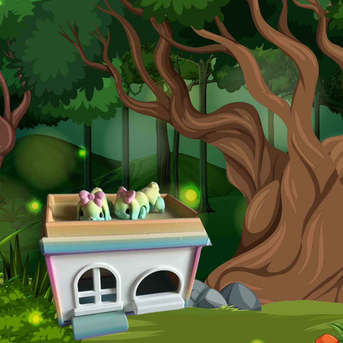 Twee nieuwsgierige konijntjes piepen boven het dak van hun pastelhuisje... misschien wachten ze op een knuffel of een nieuw avontuur? Deze lieve diertjes zijn ideaal voor thematisch spel, fantasierijke werelden en zachte momenten van verwondering.